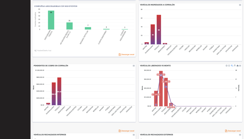 Nuestra Plataforma Modular permite a los dueños de los negocios obtener los indicadores de desempeño y rentabilidad del negocio en tiempo real, de esta manera poder tomar decisiones inmediatas. el tablero de indicadores analíticos esta diseñado para ser configurado a la medida de las necesidades de cada usuario, podrás consultar la cantidad de servicios realizados por compañía, por zona, por estado, por sucursal, así como el estatus y su información financiera. cuentas por cobrar, cuentas por pagar, inventarios vehiculares, entre muchos otros.